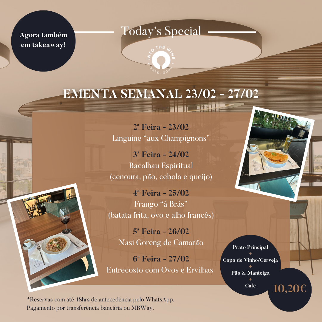 O Today’s Special by Into the Wine é a nossa proposta de Menu do dia, ideal para quem procura uma refeição equilibrada, com inspiração gastronómica e aquele toque especial do nosso Chef Samuel Correia.